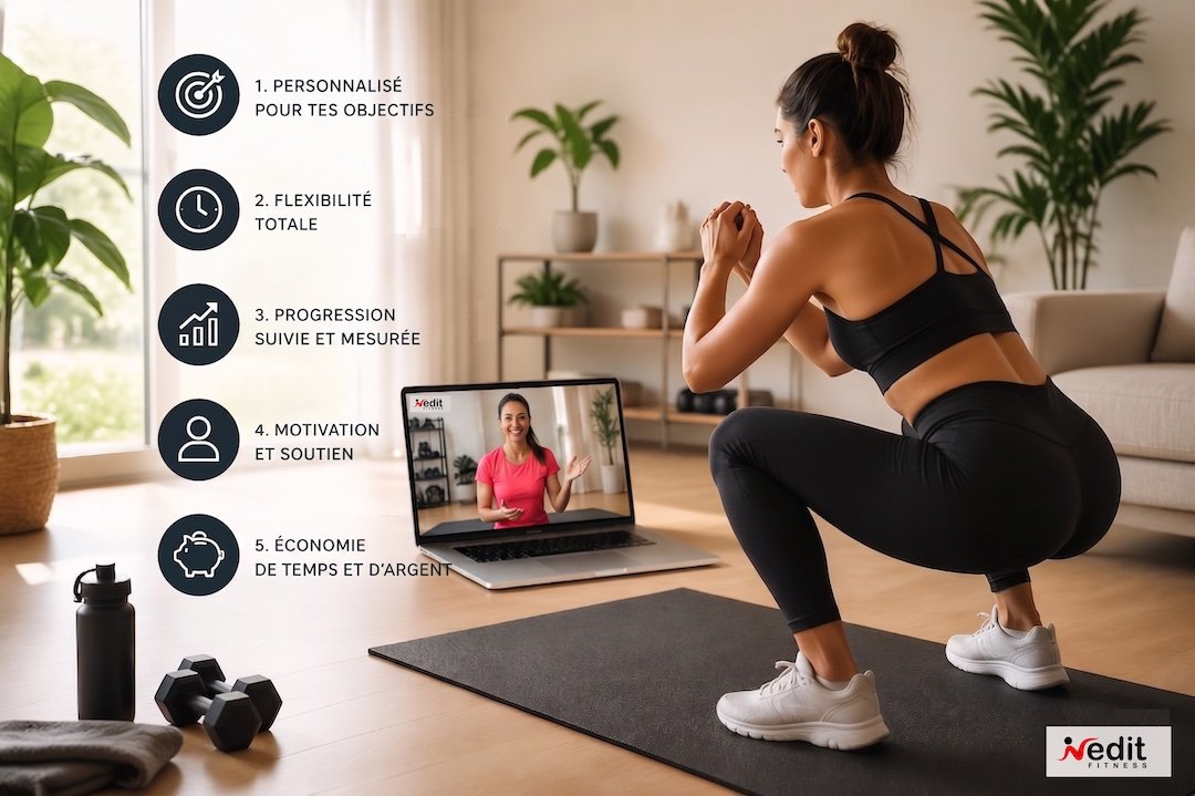 Les cinq atouts majeurs du coaching sportif personnalisé en visio incluent la personnalisation des exercices, la sécurité des mouvements que vous effectuez, la motivation que vous conservez, une meilleure hygiène de vie et des résultats durables que vous pouvez mesurer.